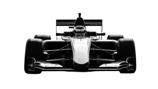 This powerful, high-contrast front view of a sleek formula 1 race car is isolated in a dramatic monochromatic studio shot.