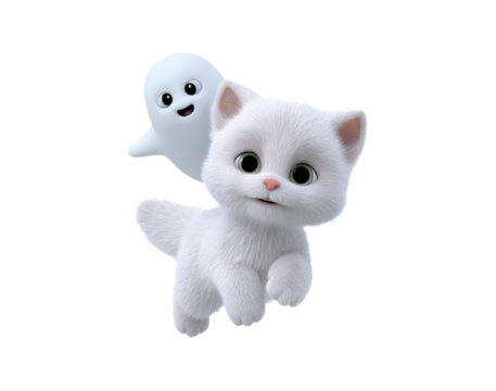 Adorable white kitten and friendly ghost floating in delightful scene on transparent background