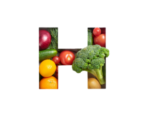 H lettering with vegetables and fruits isolated on a white background, cut out