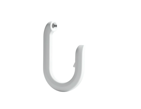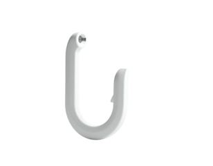 A stylized white wall hook, shaped like an upside-down "J", with a screw
