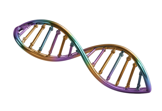 Blue and purple D N A helix with gold accents isolated on a transparent background