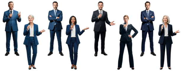 Set of diverse professional speakers and presenters with microphones