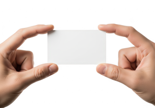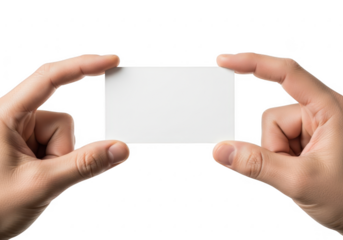 Hand holding blank white business card mockup template for text or logo presentation and promotion isolated on transparent background