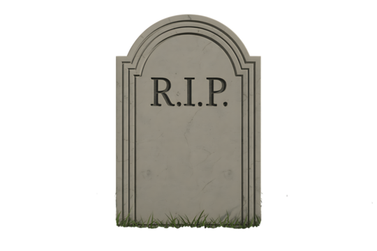 A gravestone with R.I.P. etched on it stands against a white background.