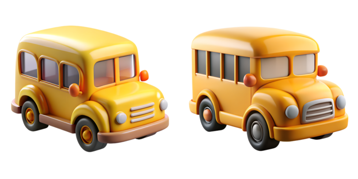 Two charming yellow 3D school bus icons with friendly cartoon aesthetics, on a transparent background, representing student transportation, education journeys, and childhood learning adventures
