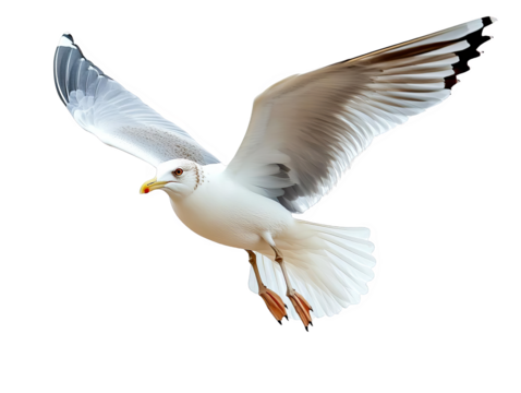 A beautiful seagull in graceful flight with open wings, isolated on white background. Perfect for nature and wildlife themes.