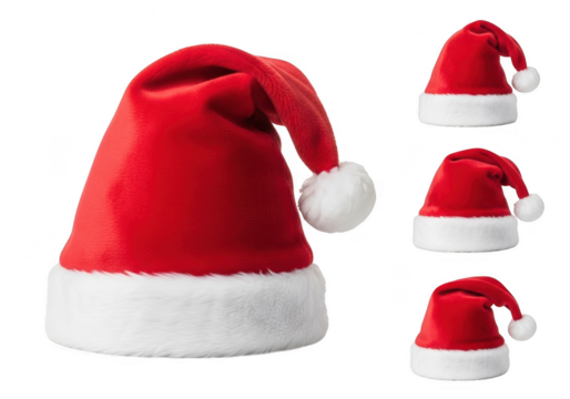 A set of red Santa hats isolated on a transparent background, soft fur texture, vibrant red fabric, ultra realistic detail, clean edges, high resolution PNG.