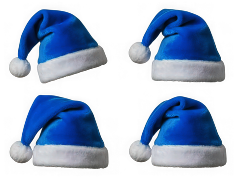 Group of luxurious blue velvet christmas santa hats with white fur pompoms floating in air, isolated on transparent background