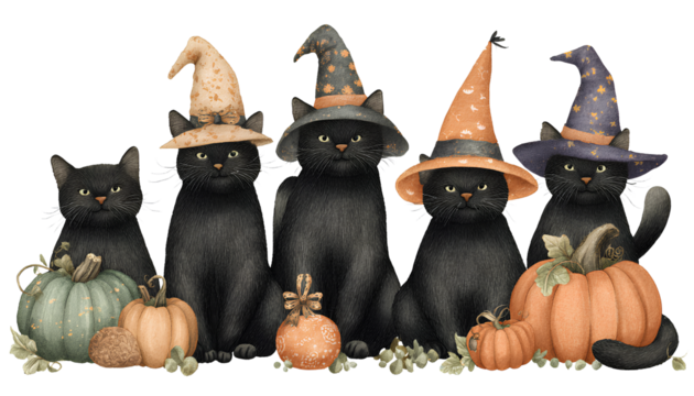 Halloween pumpkins set with smiling faces and witch hats, isolated on white background