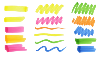 A set of colorful marker strokes on transparent background for creative design and illustration purposes