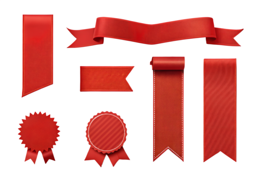 A set of red ribbon banners and labels with various textures and shapes, arranged on a white background, perfect for design and decoration purposes.