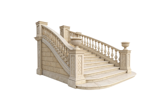 Ornate beige stone staircase with curved balustrades, decorative pillars, and urns, exuding classical architectural grandeur, isolated on a transparent background