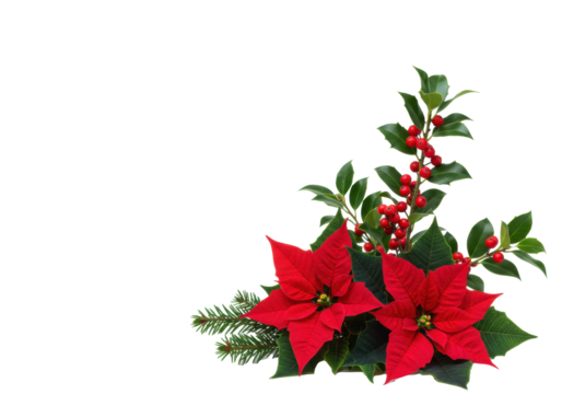 Detailed macro shot of a reflective holly garland with glossy emerald leaves and scarlet berries, isolated on a transparent background with copy space, traditional winter holiday celebration concept