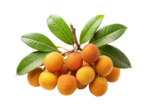 Cluster of orange Arbutus unedo fruits with green leaves on white background