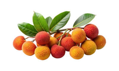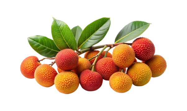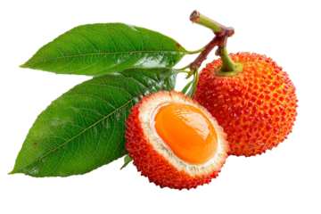 Three Arbutus Berries with Leaves Isolated on Transparent Background, arbutus unedo, red fruit, strawberry tree, fruit
