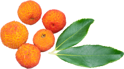 Close up of beautiful Arbutus unedo fruits and green leaves against Trensprent  Background png