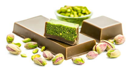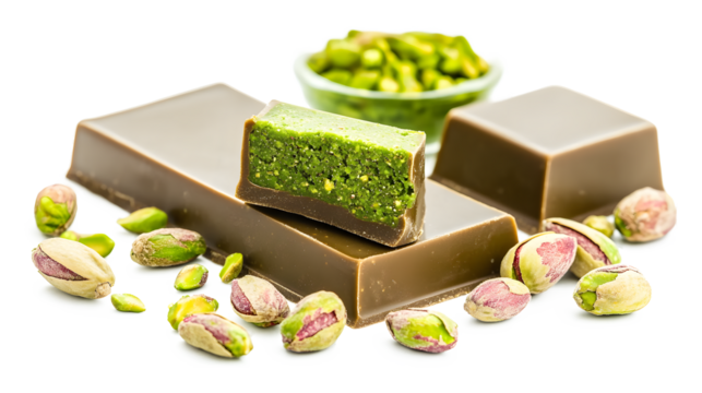 Evitation of Dubai chocolate bars with vibrant green isolated on a white background