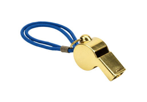 Isolated golden metal whistle with blue lanyard for referees, sports, coaches and trainers