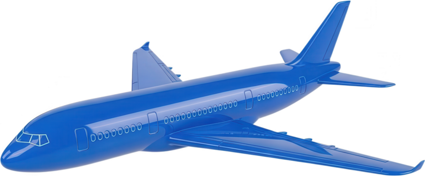 A sleek glossy blue passenger jet airplane with detailed windows and wings presented as a modern design element aircraft transport aviation travel vehicle flight flying sky transparent background