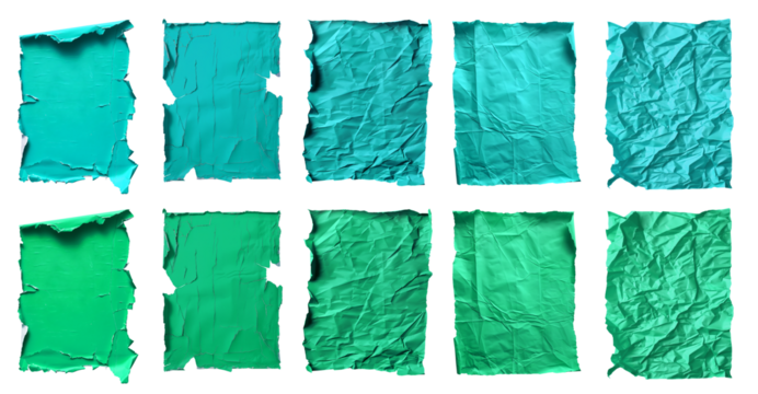 Collection set of dark light blue crushed wrinkle scrunch torn rectangle A4 paper, old tear crumple rip edges on transparent cutout, PNG. Many different design. Mockup template artwork graph