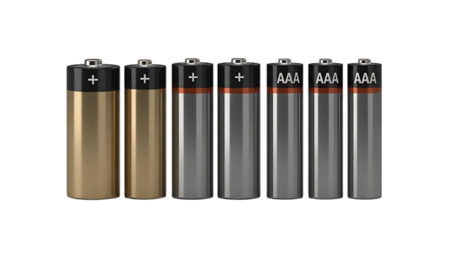 Set of AAA and AA Batteries in Gold and Silver Colors on White Background