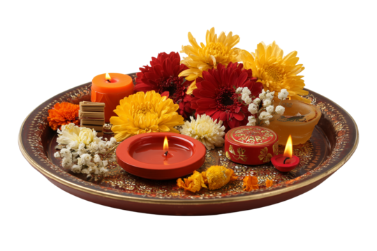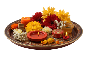 Decorative thali plate with diya incense and flowers religious offering spiritual celebration transparent background