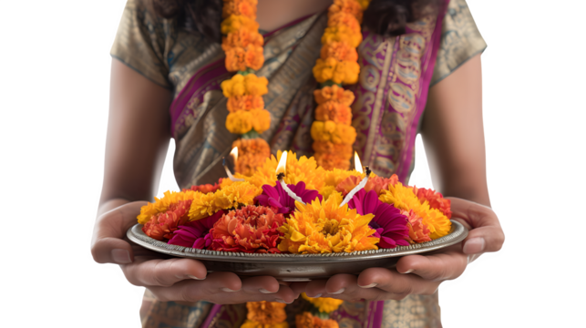 Woman holding a thali plate with diya and garland, Diwali, Indian culture, arti ceremony, traditional festival, festive celebration, png file, isolated on white