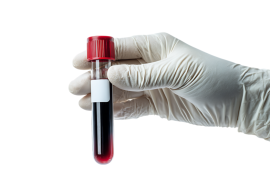 Hand wearing a black glove holding a blood sample in a test tube with a red cap isolated on transparent background