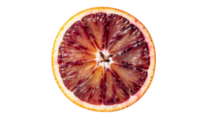 A single cross section of a blood orange fruit shows the red and orange segments and rind against a white background product shot isolated