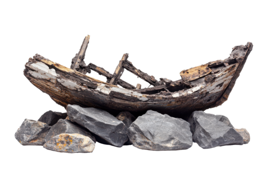 Old rusty shipwreck resting on rocks isolated on transparent background. Shipwreck wreck on rocks on white background.