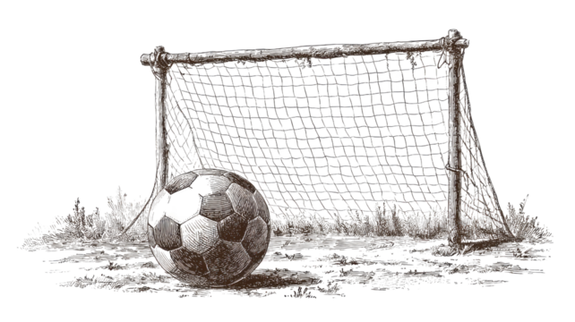 Old soccer ball resting in worn wooden goalpost with grass showing nostalgia retro sports and childhood memories concept on white background