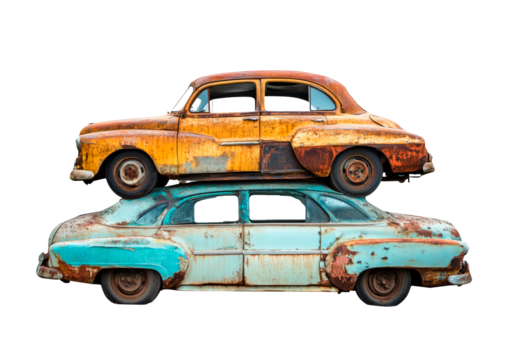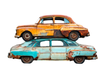 Rusty old car pile in junkyard isolated on transparent background