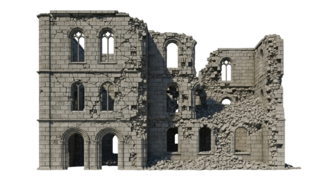 Destroyed building with transparent background representing urban decay and destruction