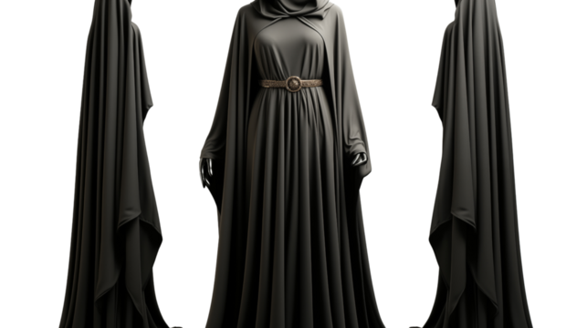 Elegant black open abaya isolated on transparent background, modern fashion apparel