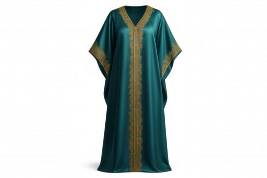 Elegant moroccan kaftan featuring ornate golden embroidery, representing traditional textile craftsmanship against transparent backdrop