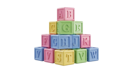 Stack of colorful alphabet blocks arranged in a pyramid shape on a white background. Letters are embossed on each block.