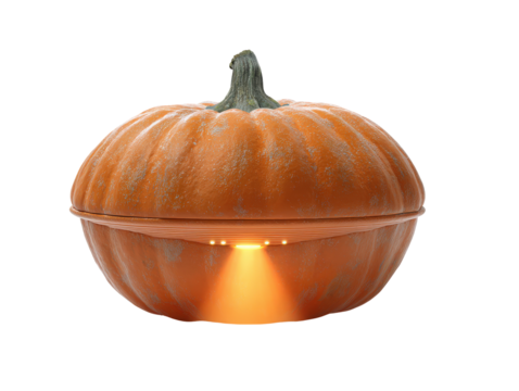 Creative orange pumpkin UFO concept with a green stem and glowing abduction beam.