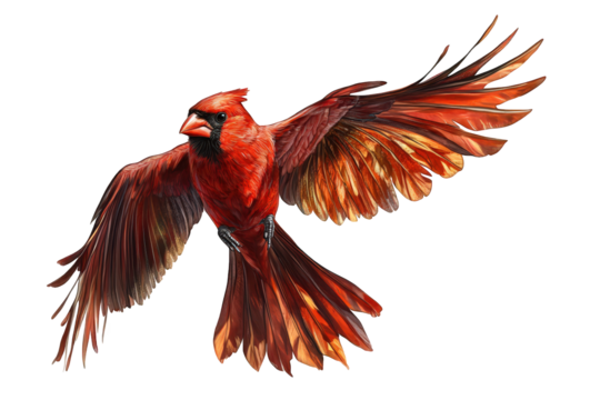 A vibrant cardinal soars, its scarlet plumage ablaze against the isolated on transparent background, wings outstretched in graceful flight, a symbol of winters beauty