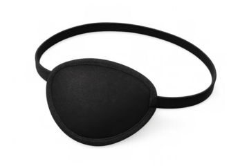 Black medical eye patch resting on clean transparent surface, indicating eye injury recovery or protective vision treatment