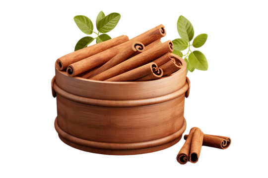 Aromatic Cinnamon Magic: A Wooden Container Abloom With Spicy Sticks and Fresh Leaves on White or PNG Transparent Background.