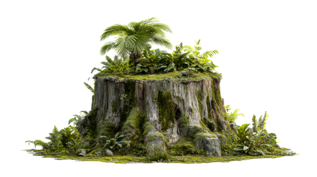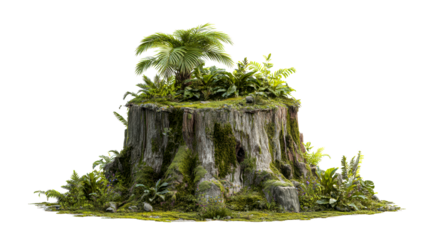 Ancient Tree Stump Abloom with Lush Tropical Flora and Moss, cut out transparent