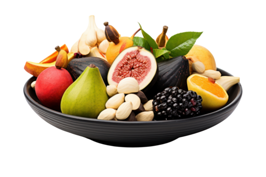Beautifully arranged fruit bowls It consists of unusually shaped fruits such as cashew nuts, figs and rambutan served in a black ceramic bowl. Isolated on a transparent background.