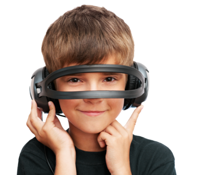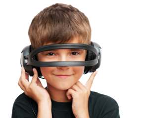 Child Wearing Headphones Unusually Over Eyes