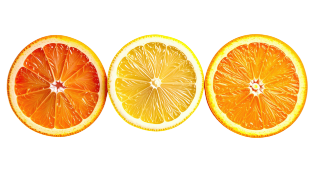 Three citrus fruit slices a blood orange, lemon, and orange, displayed against a black background