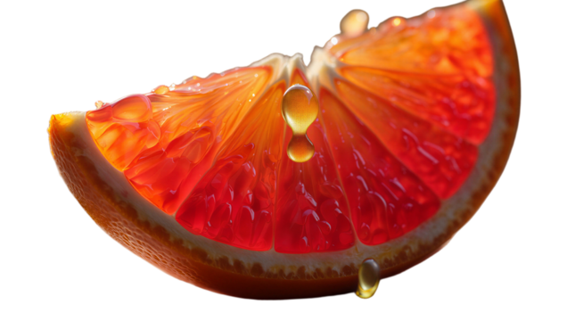 Hyper-Realistic Macro Shot of a Blood Orange Slice with Glistening Juice Droplets Isolated on a Transparent Background PNG