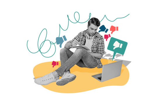 Creative banner image poster collage of guy sit writing book look laptop with many dislike