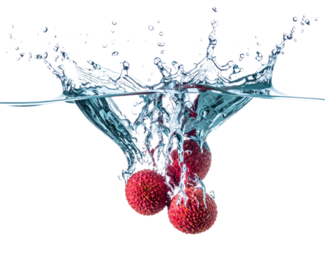 Juicy Lychee Falling into Water with Dynamic Splash Arc, Close-Up Tropical Fruit Shot, Isolated