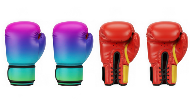 Two pairs of boxing gloves one with gradient colors and one pair in solid red color