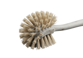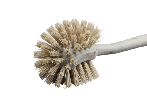 Worn dish brush, splayed discolored bristles, abraded handle on transparent studio background, authentic utility and age concept