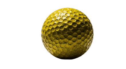 A single, yellow, well-worn, and scuffed golf ball with faded, abraded dimpled surface, isolated against a transparent background with ample negative space. Concept of enduring passion and